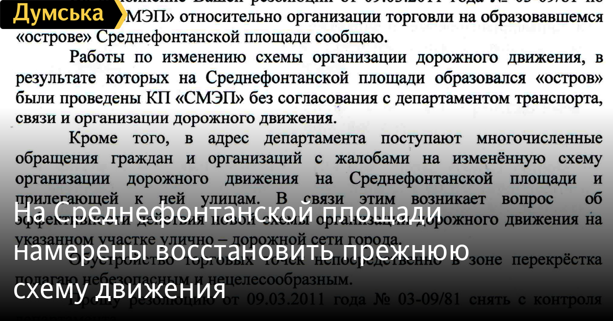 В комментарии «Думской» начальник КП «СМЭП» Вадим Черный отметил, что в исходном письме этого коммунального предприятия речь шла о переносе торговли с тротуара, полностью загроможденного цветочными и прочими павильонами на образовавшийся в результате переразметки Среднефонтанской площади «остров». Который, естественно, должен был быть соответствующим образом огорожен.