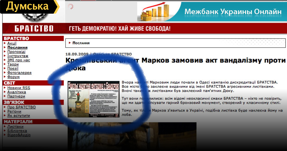 А откуда у них фото, сорванной листовки, в таком идеальном виде? Наклеенные на памятник — совсем другие — мятые и пропитавшиеся клеем. УКВ, не надо строить из себя невинную овцу и разыгрывать догадки — Ваша наигранная наивность не канает, на курсах политтехнологий надо было тщательней заниматься — переигрываете. А по поводу надписи, можно подумать в «Братстве» все великие знатоки украинского языка сидят и грамотеи. У Вас вот тоже прокольчик с письменностью:«Так і біло написано». Уж не Вы ли и писали? И опять технологический приемчик, насчет марковцев — грубо работаете, господин.