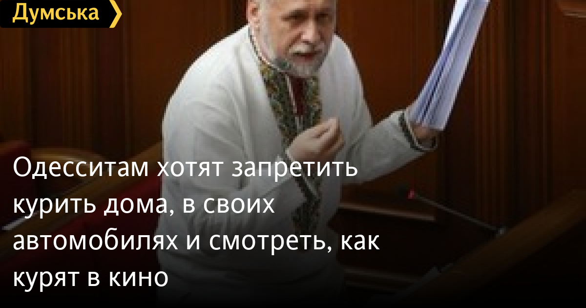 Украинцам могут запретить курить дома и в собственных автомобилях, покупать сигареты менее чем за 300 метров от остановок транспорта и смотреть на процесс курения в кинофильмах. (В общем, в таком случае придется положить на полку 95% фильмов — один Штирлиц со своим патологическим влечением к курению или Шерлок Холмс с вечной трубкой чего стоят — «Думская.net»).