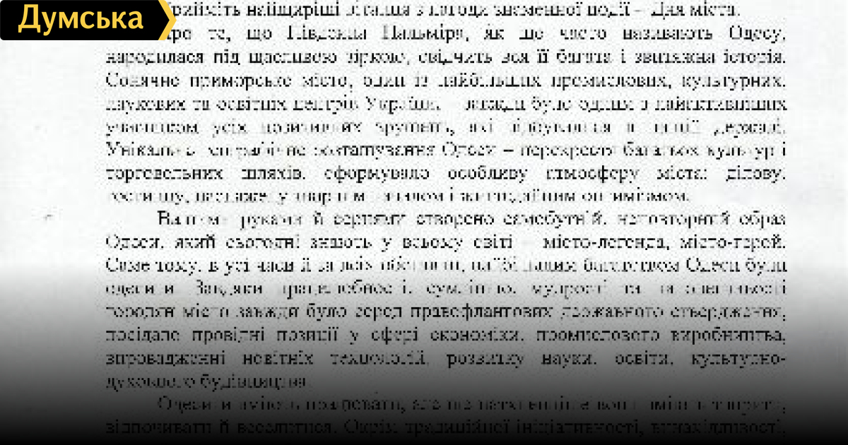 Спикер Верховной Рады Владимир Литвин направил приветственное послание одесситам ко Дню города. Жителям Одессы Вашими руками и сердцами создан самобытный, неповторимый образ Одессы, который сегодня знают во всем мире — город-легенда, город-герой. Именно поэтому, во все времена и при всех обстоятельствах, наибольшим богатством Одессы были одесситы. Благодаря трудолюбию, совести, мудрости и настойчивости горожан город всегда занимал ведущие позиции в сфере экономики, промышленного производства, внедрении новейших технологий, развития науки, образования, культурно-духовного строительства. Одесситы умеют работать, но еще вдохновеннее они умеют творить, отдыхать и веселиться. Помимо традиционной инициативности, изобретательности, деловой смекалки, их всегда отличало гостеприимство, сердечность, оптимизм и неповторимый, одесский, известный во всем мире, юмор. Сюда, в одесские театры и музеи, на уникальные фестивали и юморины стремятся попасть любители со всех уголков не только нашей страны. В этот праздничный день, уважаемые одесситы, от всей души желаю каждом доме, каждой одесской семье мира, добра, благополучия, семейного уюта. Владимир Литвин СМЕРТЬ РОСІЙСЬКИМ ОКУПАНТАМ! Помітили помилку? Виділяйте слова з помилкою та натискайте control-enter |