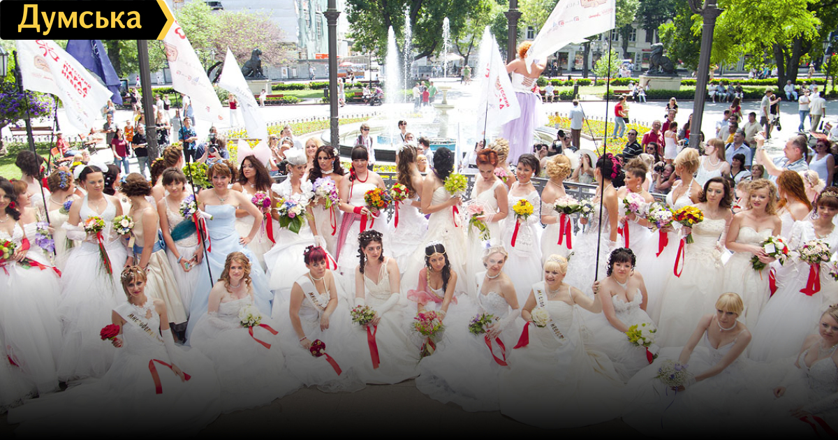 Возле одного из торговых центров на Дерибасовской колонна невест как бы случайно выстраивается в причудливую фигурку.