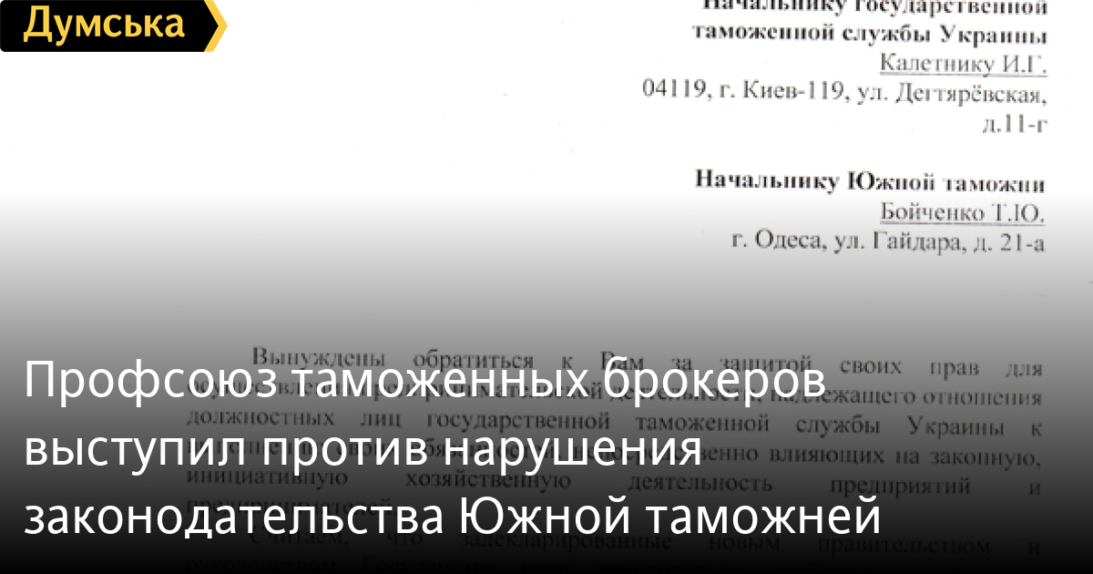 Профсоюз таможенных брокеров и предпринимателей Одессы обратился с официальным письмом к вице-премьеру Украины Сергею Тигипко, начальнику таможенной службы Украины Игорю Калетнику в связи с систематическими нарушениями должностными лицами Южной таможни законодательства Украины.