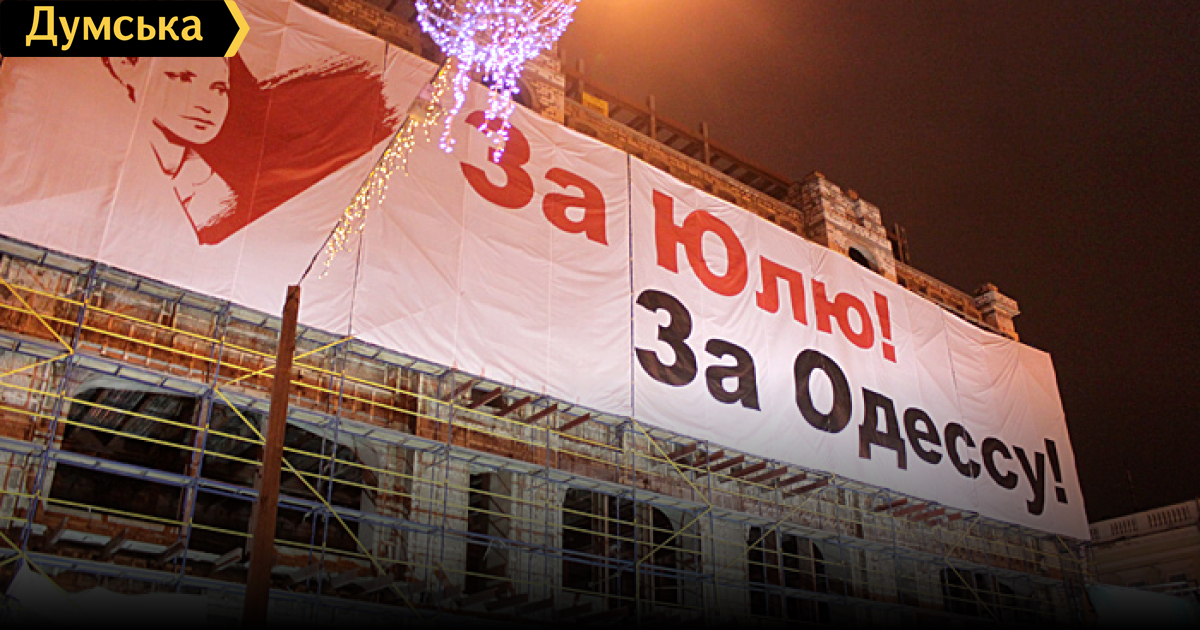 Гигантский плакат в подержку кандидата в Президенты Украины от БЮТ расположен на улице Дерибасовской, на реконструируемом ныне здании одной из красивейших когда-то гостиниц города — «Большой Московской».