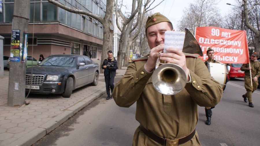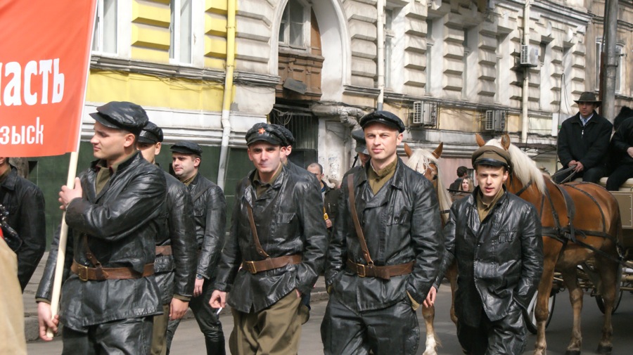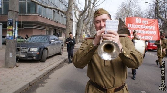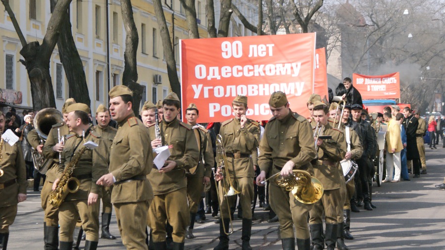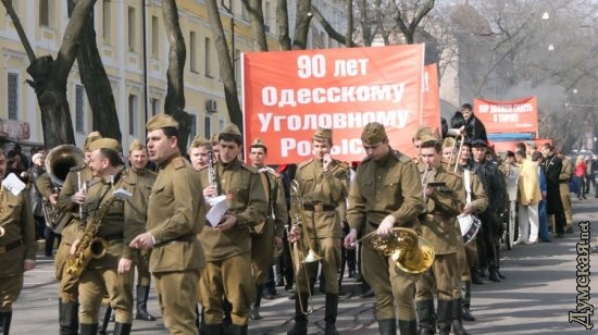 Сегодня возле здания областного управления внутренних дел граждане с удивлением могли увидеть сотрудников милиции, перенесенных машиной времени в 2009 год из прошлых лет. Они добродушно беседовали с известными одесскими преступниками — Мишкой Япончиком, Сонькой — Золотой Ручкой, Манькой Абле , простите, Облигацией и даже — с махновцами. На тачанке с пулеметом, запряженной двумя лошадьми, восседала огромная черная кошка в наручниках. И сотрудники милиции, и «преступники» выстроились в одну колонну, которую замыкает грузовик с саженцами деревьев и полевой кухней. На борту грузовика транспорант с надписью: «Сажаем не только преступников» и подписью: «Одесский уголовный розыск». Духовой оркестр играет различные мелодии, начиная с «Мурки», заканчивая «Интернационалом». Таким маскарадом одесские сыщики отмечают не только и даже не столько 1 апреля, сколько 90-летие уголовного розыска, который будет отмечаться 15 апреля. В настоящий момент колонна направляется к Парку Победы, где и будут посажены 90 деревьев. Около многих из них будут установлены таблички с именами одесских преступников прошлых лет. Как отметил заместитель начальника областной милиции Алексей Хлевной, табличек с именами современных преступников не будет, чтобы милицию не затаскали по судам. В Парке Победы сотрудников милиции будет ожидать не только работа по посадке деревьев, но и горячая гречневая каша, приготовленная на полевой кухне. Роли «преступников» и милиционеров прошлых лет исполняют сотрудники уголовного розыска. СМЕРТЬ РОСІЙСЬКИМ ОКУПАНТАМ! Помітили помилку? Виділяйте слова з помилкою та натискайте control-enter |