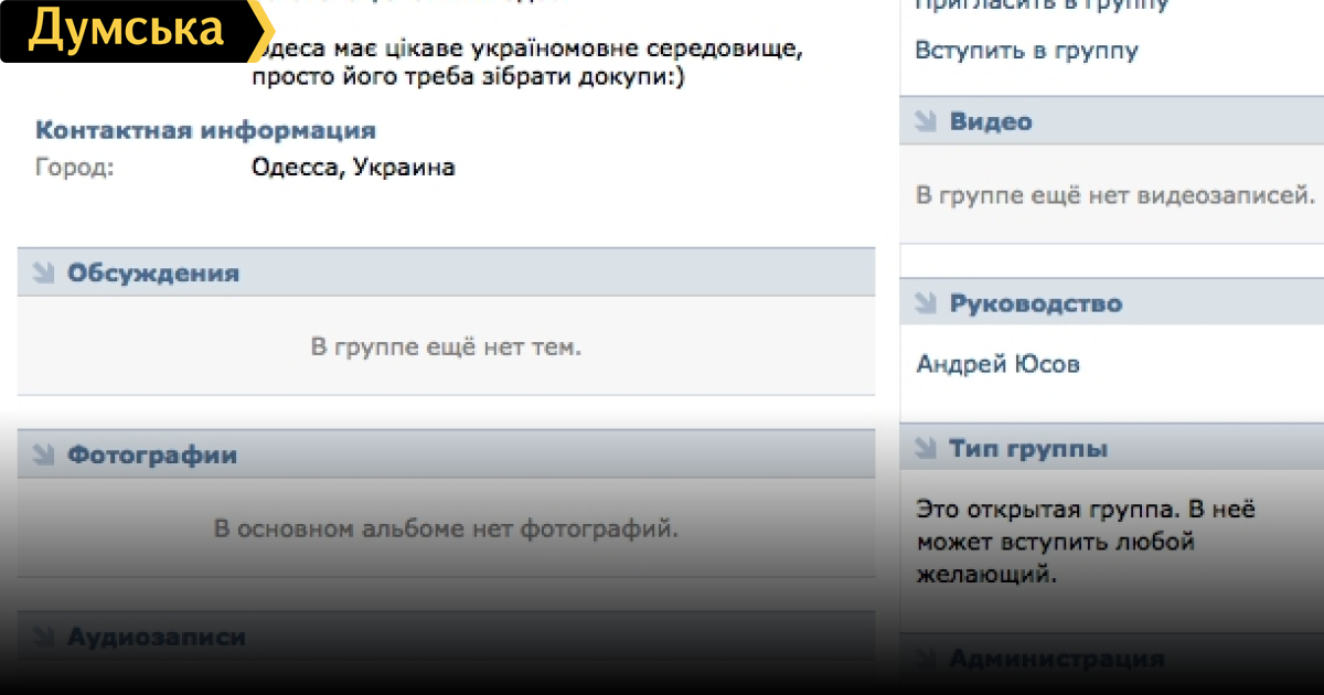 Начальник управления молодёжной и семейной политики одесского горсовета Андрей Юсов, позиционирующий себя, как «последовательный патриот Украины», «борец с украинофобией и ультранационализмом», но не забывающий при этом дружить и покровительствовать различным националистическим организациям (УНА-УНСО, Свобода, Просвита и др). создал в социальной сети «В контакте» группу «Украиноязычные одесситы» — http://vkontakte.ru/club16419931