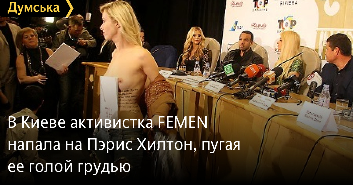 На американскую актрису, певицу и фотомодель Пэрис Хилтон, которая была членом жюри конкурса «Мисс Украина-2011», напала активистка женского движения FEMEN. Как передает УНИАН, инцидент произошел 11 сентября во время пресс-конференции в национальном дворце искусств «Украина» в Киеве, где походил финал конкурса.