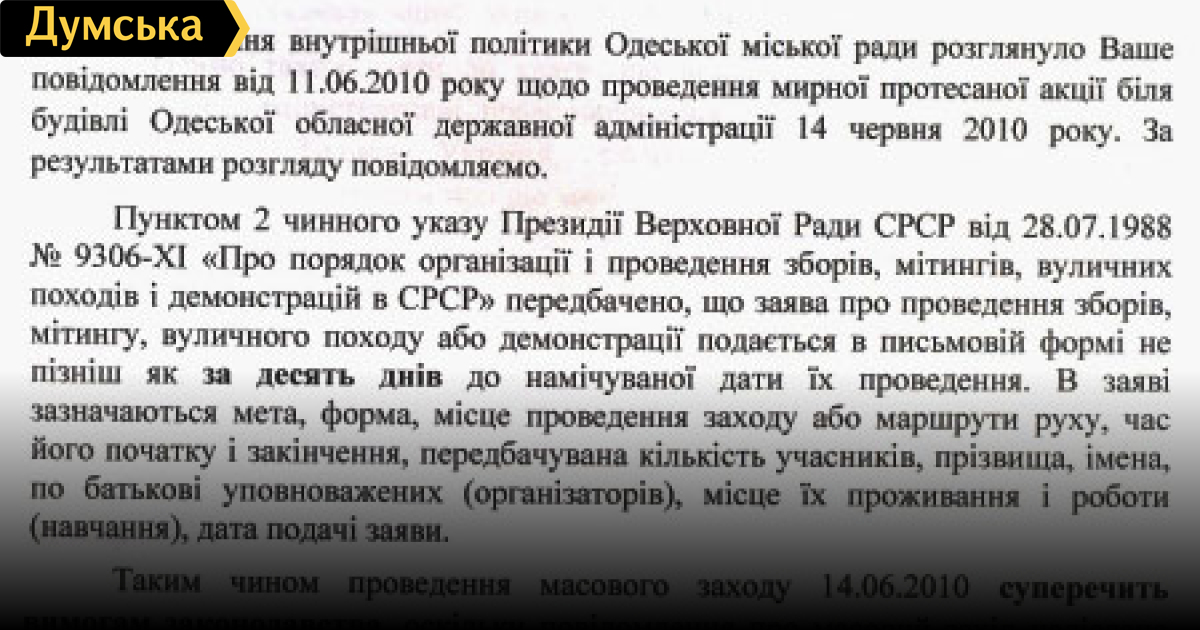 Автор письма,  начальник управления внутренней политики Одесского городского совета  ссылался на указ президиума Верховной Рады УССР от  1988 года «О порядке организации и проведения собраний,  митингов, уличных акций и демонстраций в СССР».