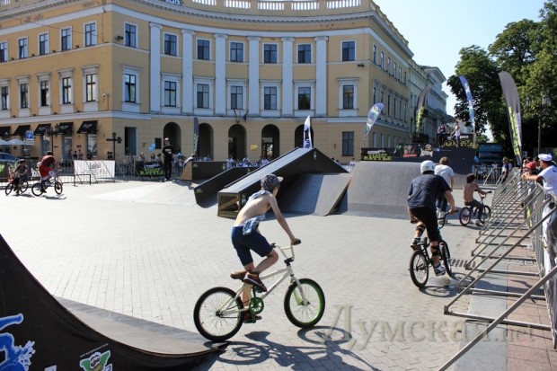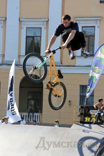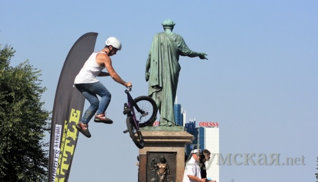 Возле Дюка летали на велосипедах и рекламировали голубых гномов