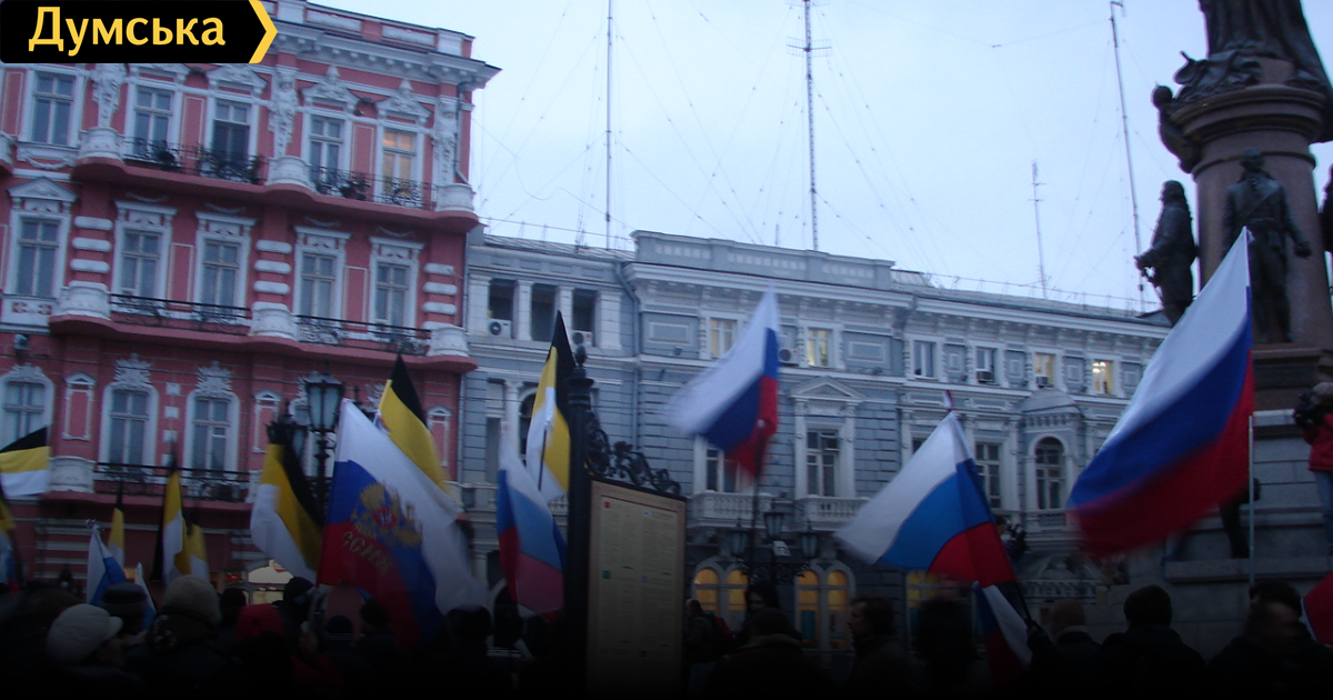 В этот момент со стороны ул. Екатерининской подошла группа их противников — около 10 человек. По некоторым данным, это представители движения «Братство», «Свободная Одесса». Они скандируют «Мрази, убирайтесь из Одессы!», «Свободу российским политзекам!». Протестующих разделяет живая стена сотрудников милиции и «Беркута».