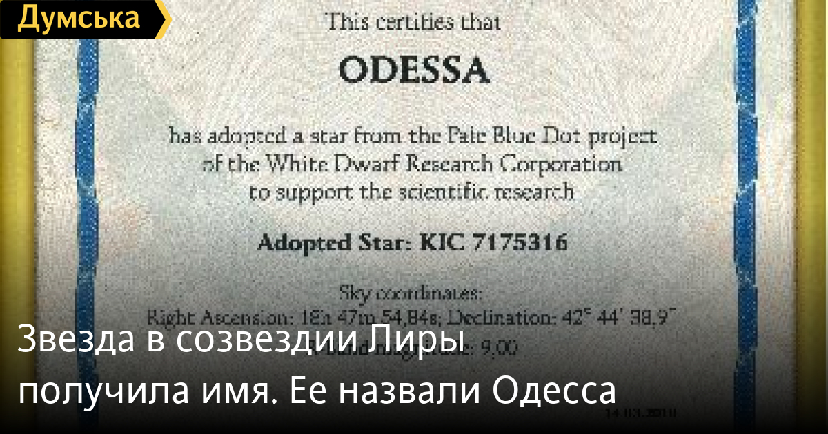 Вчера, 14 марта, в одесской мэрии состоялась встреча первого заместителя городского головы Анатолия Ворохаева с участниками проекта Twinning Space «Ускорение украинско-европейского сотрудничества в космической сфере». Во встрече приняли участие представители Национального космического агентства Украины (НКАУ), Аэрокосмического Центра Германии (DLR) и Национального центра космических исследований Франции (CNES). Гости кратко ознакомились c историей и культурными традициями нашего города, планами его развития. По окончанию встречи гости вручили сертификат о присвоении звезде, расположенной в созвездии Лиры, имени ОDESSA. Параметры звезды: Номер KIC 7175316, Присвоено имя ODESSA, координаты: Прямое восхождение (R.A.) 18h 47m 54,84s Склонение (Dec.) 42градуса 44’38,9’’.