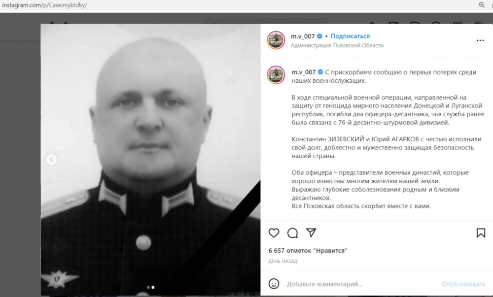 Как следует из некрологов, которые уже расходятся по российских ресурсам, Агарков был в Украине не один, а со всем своим 33-м полком, и умер отнюдь не от коронавируса. Полк тоже понес тяжелые потери.