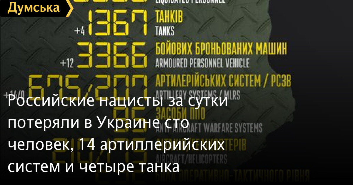 Сто солдат, четыре танка и одну крылатую ракету потеряли российские нацисты за минувшие сутки в Украине.