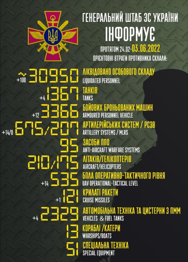 Кроме того, как сообщает Генштаб Вооруженных сил, украинские защитники уничтожили 12 боевых бронированных машин, 14 артиллерийских систем, 14 БПЛА оперативно-тактического уровня, четыре единицы автомобильной техники.