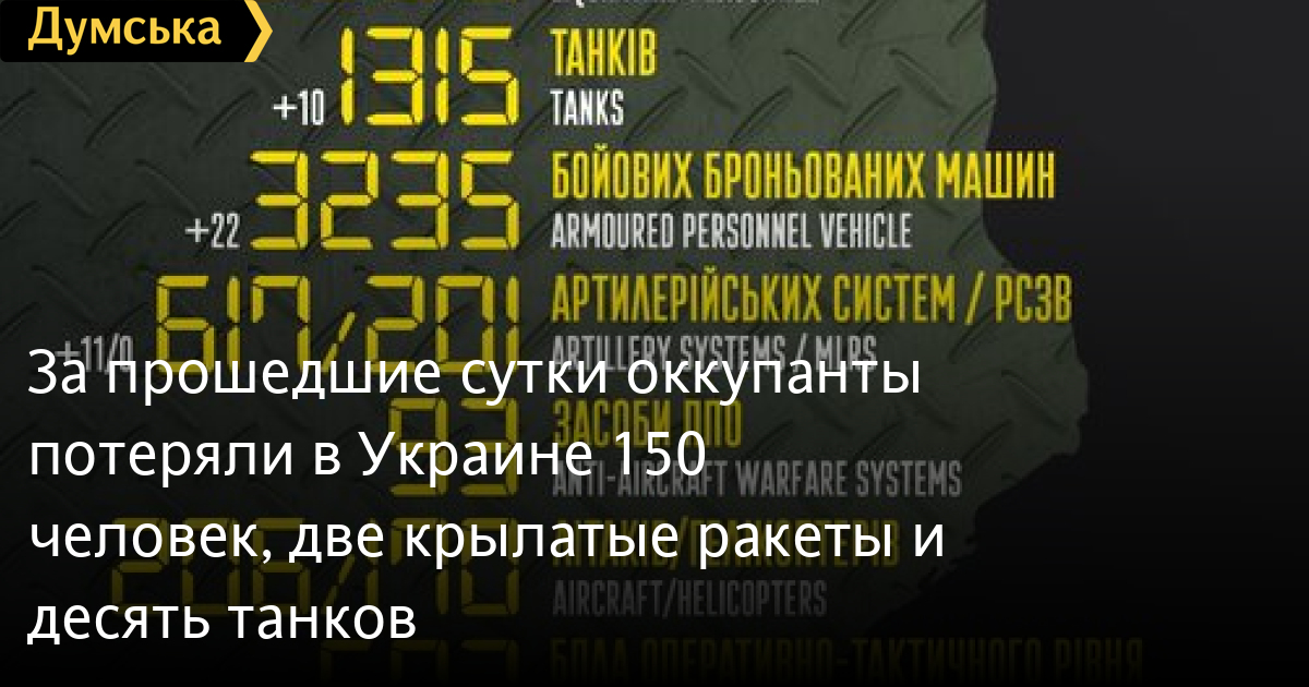 150 солдат, десять танков и две крылатые ракеты потеряли российские нацисты за минувшие сутки в Украине.
