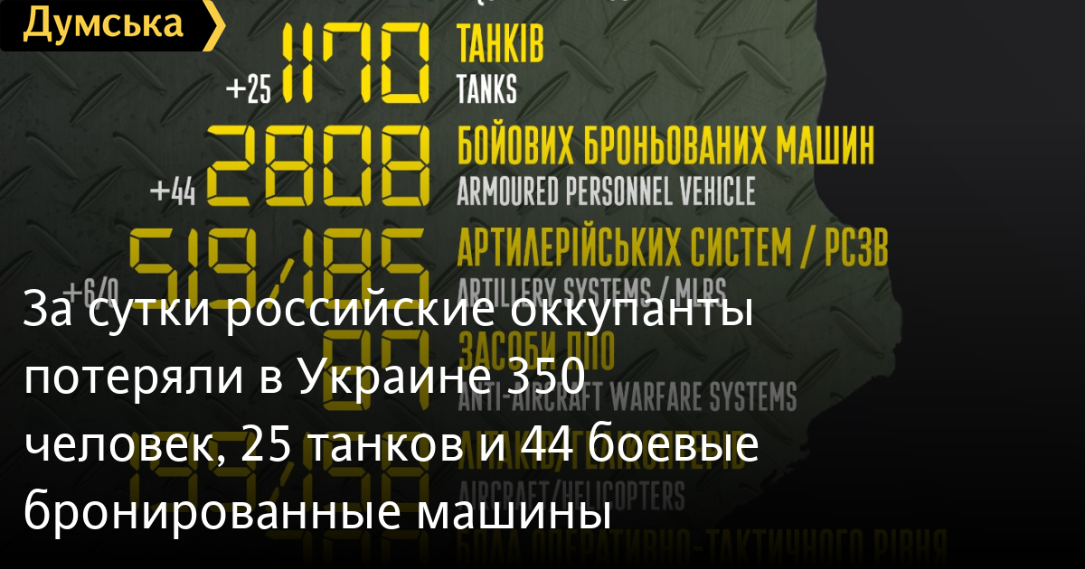350 солдат, 25 танков и шесть артиллерийских систем потеряли российские нацисты за минувшие сутки в Украине.
