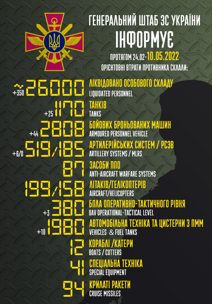 Кроме того, как сообщает Генштаб Вооруженных сил, украинские защитники уничтожили 44 боевые бронированные машины, три БПЛА оперативно-тактического уровня и десять единиц автомобильной техники.
