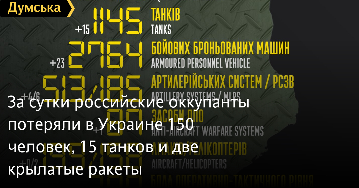 150 солдат, 15 танков и два вертолета потеряли российские нацисты за минувшие сутки в Украине.