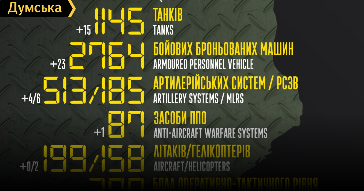 За сутки российские оккупанты потеряли в Украине 150 человек, 15 танков и две крылатые ракеты150 солдат, 15 танков и два вертолета потеряли российские нацисты за минувшие сутки в Украине. Кроме того, как сообщает Генштаб Вооруженных сил, украинские защитники уничтожили шесть РСЗО, четыре артиллерийские системы, 23 боевые бронированные машины, девять единиц автомобильной техники, одно средство ПВО, 17 БПЛА оперативно-тактического уровня, две единицы спецтехники и две крылатые ракеты. Всего с начала полномасштабного вторжения потери врага составили: личного состава — 25 650 человек; танков ‒ 1145 единиц; боевых бронированных машин — 2764 единицы; артиллерийских систем — 513 единиц; РСЗО — 185 единиц; средств ПВО - 87 единиц; самолетов – 199 единиц; вертолетов – 158 единиц; автомобильной техники и автоцистерн — 1970 единиц; корабли/катера — 12 единиц; БПЛА оперативно-тактического уровня – 377; специальная техника – 41; крылатые ракеты – 94. СМЕРТЬ РОСІЙСЬКИМ ОКУПАНТАМ! Помітили помилку? Виділяйте слова з помилкою та натискайте control-enter |