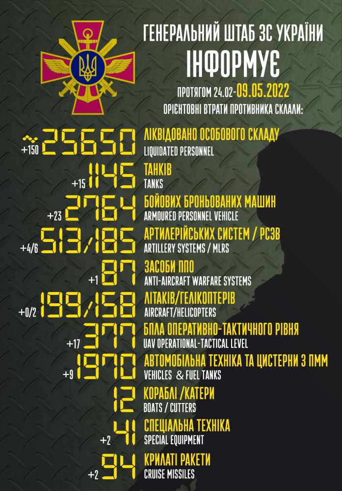 Кроме того, как сообщает Генштаб Вооруженных сил, украинские защитники уничтожили шесть РСЗО, четыре артиллерийские системы, 23 боевые бронированные машины, девять единиц автомобильной техники, одно средство ПВО, 17 БПЛА оперативно-тактического уровня, две единицы спецтехники и две крылатые ракеты.