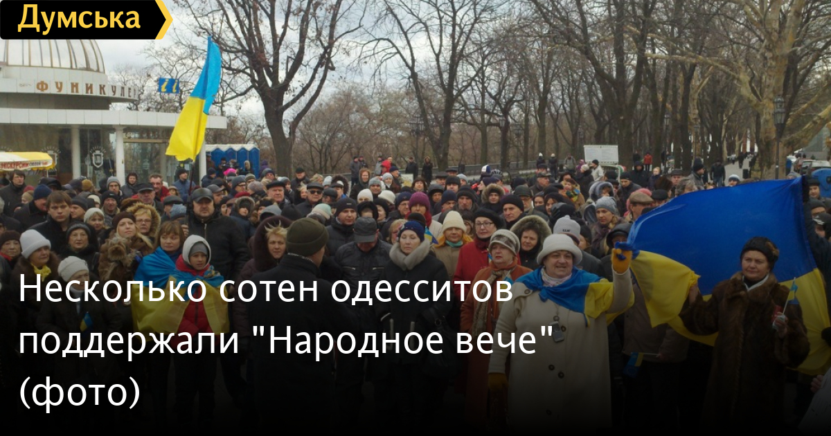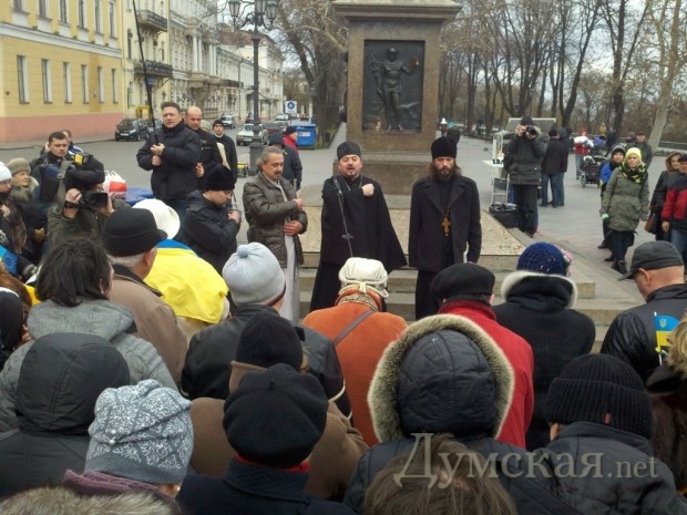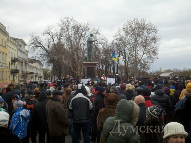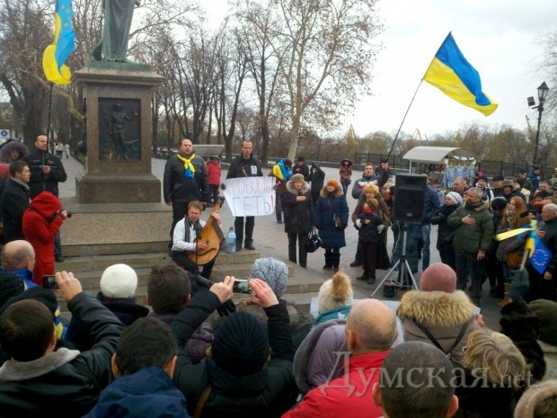 Несмотря на прохладную погоду, несколько сотен одесситов собрались сегодня на Приморском бульваре около памятника Дюку, чтобы выразить свою поддержку массовой акции протеста, проходящей в Киеве.