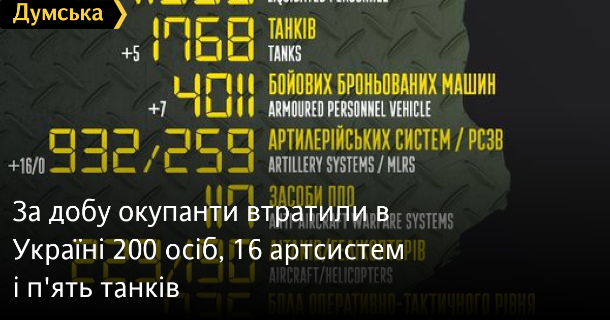 За добу окупанти втратили в Україні 200 осіб, 16 артсистем і п'ять танків200 осіб, п'ять танків і 16 артсистем втратили окупанти за минулу добу в Україні. Крім того, за даними Генерального штабу Збройних сил України, українські захисники також знищили сім бойових броньованих машин, один БПЛА оперативно-тактичного рівня, десять одиниць автомобільної техніки і дві одиниці спеціальної техніки. Усього з початку повномасштабного вторгнення втрати ворога склали: особового складу — 41 030 осіб; танків — 1768 одиниць; бойових броньованих машин ‒ 4011 одиниць; артилерійських систем – 932 одиниці; РСЗВ — 259 одиниць; засоби ППО - 117 одиниць; літаків – 223 одиниці; гелікоптерів – 190 одиниць; БПЛА оперативно-тактичного рівня — 736; крилаті ракети — 174; кораблі /катери — 15 одиниць; автомобільної техніки та автоцистерн — 2912 одиниць; спеціальна техніка — 82. СМЕРТЬ РОСІЙСЬКИМ ОКУПАНТАМ! Помітили помилку? Виділяйте слова з помилкою та натискайте control-enter |