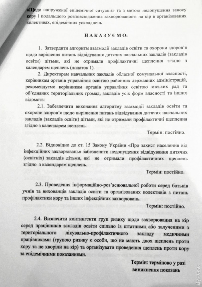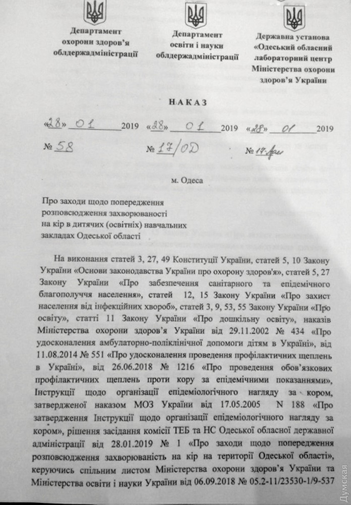 Очевидно, этот совместный приказ — попытка отреагировать на ситуацию с корью. С начала года по Украине этой болезнью заразились более 12 тысяч человек. Минздрав собирался объявить эпидемию кори, однако Кабмин принять такое решение отказался. В Одессе ситуация спокойнее: с начала года зафиксировано 142 случая.