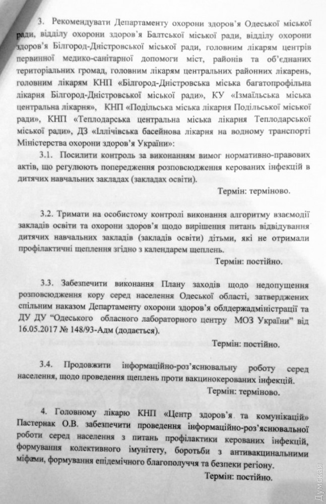 Директорам областных учебных учреждений приказано, а городским коммунальным — рекомендовано: выполнять алгоритм, обеспечить недопуск непривитых детей, определить группы риска среди педагогов и организовать их вакцинацию против кори по эпидпоказаниям.