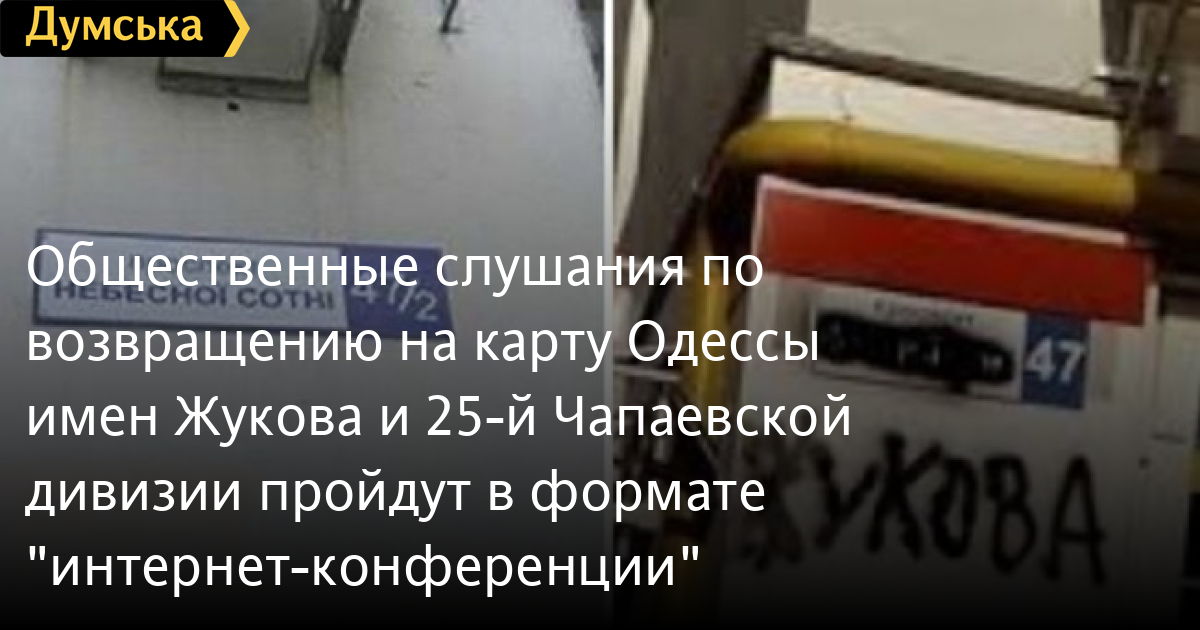 Напомним, еще летом, в рамках своей предвыборной кампании, мэр Геннадий Труханов пообещал вернуть упомянутым улицам декоммунизированные названия «Маршала Жукова» и «25-й Чапаевской дивизии». 16 сентября он распорядился созвать по данному вопросу общественные слушания. Через месяц переименование одобрила историко-топонимическая комиссия при горсовете.