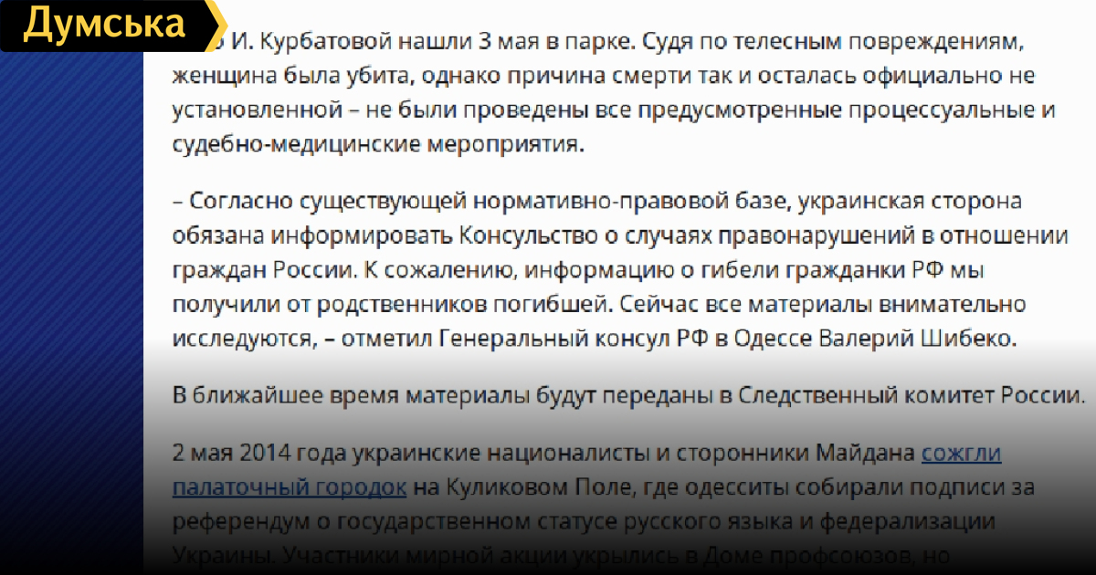Так, в сюжете от 7 октября рассказывается о гражданке России, чье тело якобы было найдено 3 мая в зеленой зоне Куликова поля (что является ложью).