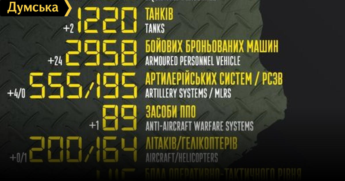 За сутки российские оккупанты потеряли в Украине 200 человек, один вертолет и 24 боевые бронированные машины200 солдат, 24 боевые бронированные машины и четыре артиллерийские системы потеряли российские нацисты за минувшие сутки в Украине. Кроме того, как сообщает Генштаб Вооруженных сил, украинские защитники уничтожили два танка, один вертолет, одно средство ПВО, пять БПЛА оперативно-тактического уровня и 28 единиц автомобильной техники. Всего с начала полномасштабного вторжения потери врага составили: личного состава — 27 400 человек; танков — 1220 единиц; боевых бронированных машин — 2958 единиц; артиллерийских систем – 555 единиц; РСЗО — 195 единиц; средства ПВО - 89 единиц; самолетов – 200 единиц; вертолетов – 164 единицы; БПЛА оперативно-тактического уровня — 416; крылатые ракеты — 95; корабли/катера — 13 единиц; автомобильной техники и автоцистерн — 2087 единиц; специальная техника – 42. СМЕРТЬ РОСІЙСЬКИМ ОКУПАНТАМ! Помітили помилку? Виділяйте слова з помилкою та натискайте control-enter |
