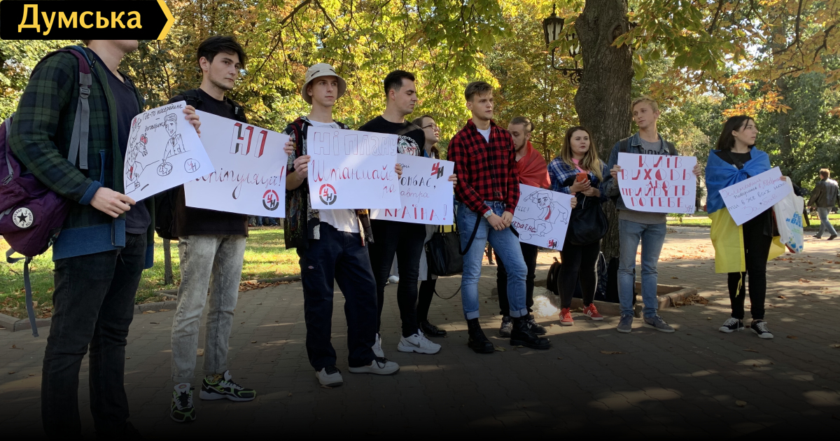 Как передает корреспондент «Думской», на митинг пришли молодые люди, которые назвались представителями общественной организации «Український наступ». Они держали в руках плакаты с изобретательными надписями.