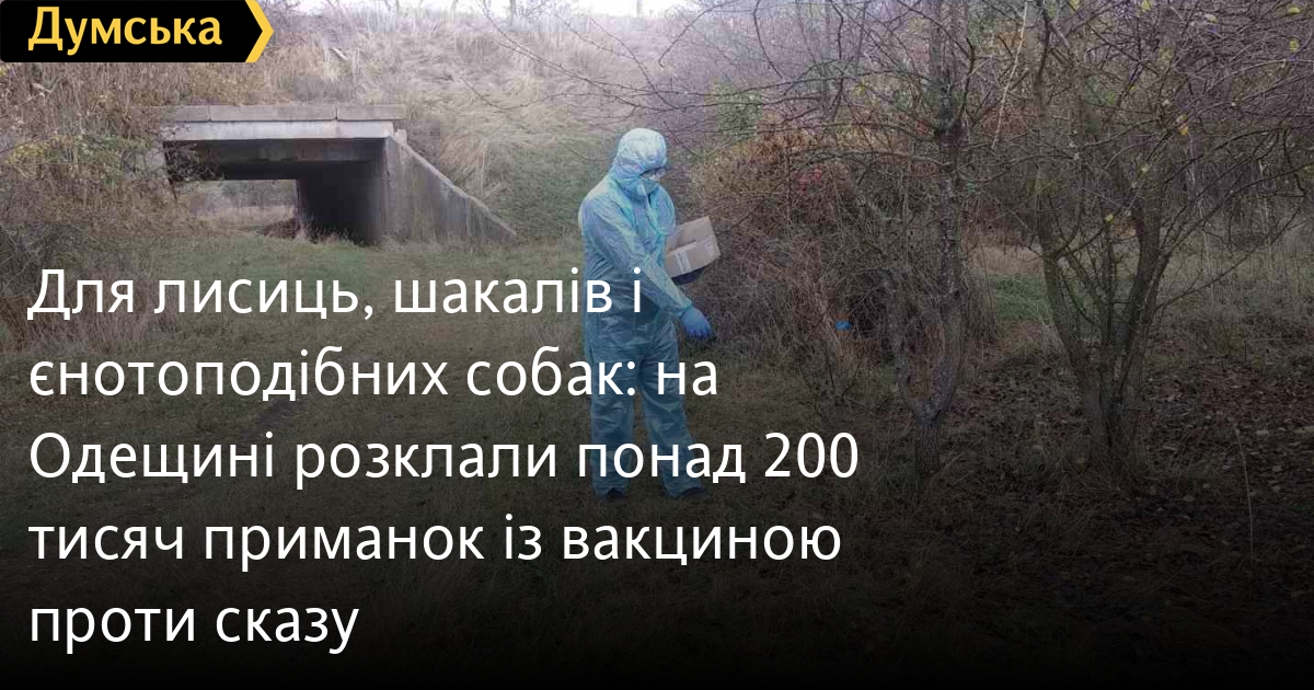 Для лисиць, шакалів і єнотоподібних собак: на Одещині розклали понад 200 тисяч приманок із вакциною проти сказуПонад 200 тисяч приманок із дозами вакцини проти сказу для диких тварин вручну розклали в Одеській області. Імунізацію лисиць, шакалів і єнотоподібних собак провели на території семи районів, повідомили в Держспоживслужбі. Для цього задіяли 120 груп, до яких увійшли 900 ветеринарів, єгерів і лісників. «Звертаємося до жителів Одеської області. У разі виявлення приманок просимо не чіпати їх, не переносити в інші місця», — йдеться у повідомленні. Помітили помилку? Виділяйте слова з помилкою та натискайте control-enter |