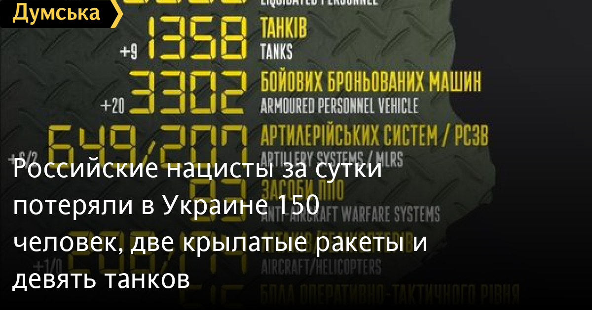 150 солдат, девять танков и один самолет потеряли российские нацисты за минувшие сутки в Украине.