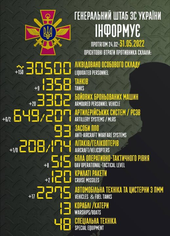 Кроме того, как сообщает Генштаб Вооруженных сил, украинские защитники уничтожили 20 боевых бронированных машин, шесть артиллерийских систем, две РСЗО, восемь БПЛА оперативно-тактического уровня, две крылатые ракеты и 11 единиц автомобильной техники.