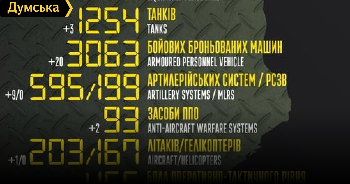 За сутки российские нацисты потеряли в Украине 200 человек, один самолет и девять артиллерийских систем200 солдат, один самолет и три танка потеряли российские нацисты за минувшие сутки в Украине. Кроме того, как сообщает Генштаб Вооруженных сил, украинские защитники уничтожили 20 боевых бронированных машин, девять артиллерийских систем, два средства ПВО, 14 БПЛА оперативно-тактического уровня и 20 единиц автомобильной техники. Всего с начала полномасштабного вторжения потери врага составили: личного состава — 28 500 человек; танков ‒ 1254 единицы; боевых бронированных машин ‒ 3063 единицы; артиллерийских систем – 595 единиц; РСЗО — 199 единиц; средства ПВО - 93 единицы; самолетов – 203 единицы; вертолетов – 167 единиц; БПЛА оперативно-тактического уровня – 455; крылатые ракеты — 103; корабли/катера — 13 единиц; автомобильной техники и автоцистерн — 2157 единиц; специальная техника – 43. СМЕРТЬ РОСІЙСЬКИМ ОКУПАНТАМ! Помітили помилку? Виділяйте слова з помилкою та натискайте control-enter |
