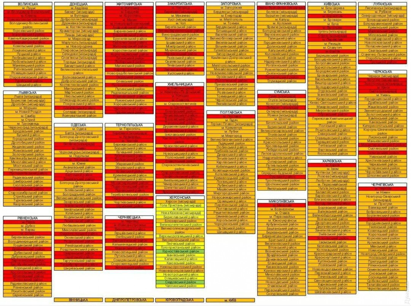 Уровни эпидемической опасности распространения COVID-19 обновила сегодня Государственная комиссия по вопросам техногенно-экологической безопасности и чрезвычайных ситуаций. Новое зонирование начнет действовать с полуночи 2 ноября 2020 года, сообщили в пресс-службе правительства. В Одесской области к уже находящимся в красной зоне Беляевке, Измаилу, Теплодару, Балтскому, Березовскому, Ивановскому, Овидиопольскому, Подольскому, Савранскому и Татарбунарскому районам добавились Саратский и Лиманский районы. Наиболее жесткие ограничения введены в Беляевке, Теплодаре, Балтском, Березовском, Ивановском, Лиманском, Саратском и Татарбунарском районе. Там после каникул не откроются школы, запрещены регулярные и нерегулярные перевозки пассажиров, концерты, должны быть закрыты кафе, рестораны и торгово-развлекательные центры, часть торговых точек. В Измаиле школы и общественный транспорт будут работать. Запрещена деятельность субъектов хозяйствования в сфере культуры, кроме автоконцертов, торгово-развлекательных центров и посещение получателями социальных или реабилитационных услуг учреждений и организаций, которые оказывают социальные или реабилитационные услуги семьям, лицам, которые находятся в сложных жизненных условиях, кроме учреждений и организаций, которые предоставляют социальные услуги экстренно (кризисно), центров учета бездомных лиц, мобильных бригад социально-психологической помощи, социального патрулирования. В оранжевой зоне остаются Одесса, Балта, Белгород-Днестровский, Черноморск, Подольск, Южный, Ананьевский, Арцизский, Белгород-Днестровский, Беляевский, Болградский, Великомихайловский, Захарьевский, Измаильский, Килийский, Кодымский, Любашевский, Николаевский, Окнянский, Ренийский, Раздельнянский, Тарутинский и Ширяевский районы. СМЕРТЬ РОССИЙСКИМ ОККУПАНТАМ! Заметили ошибку? Выделяйте слова с ошибкой и нажимайте control-enter Новости по этой теме: 4 марта 2023: "Вакцини-довгожителі", або Як щеплення проти COVID-19 перетворилися в Україні на небезпечний ритуал 27 января 2023: МОЗ обязали опубликовать договоры на закупку вакцин против COVID-19: апелляционный суд удовлетворил иск журналиста "Думской" 11 января 2023: За неделю в Одессе зафиксировано 159 случаев ковида 4 января 2023: За неделю в Одессе зарегистрировано 113 случаев ковида |