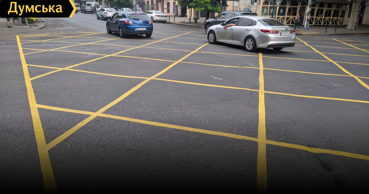 Два перекрестка на Ришельевской расчертили желтыми квадратами: новая разметка позволит бороться с заторами