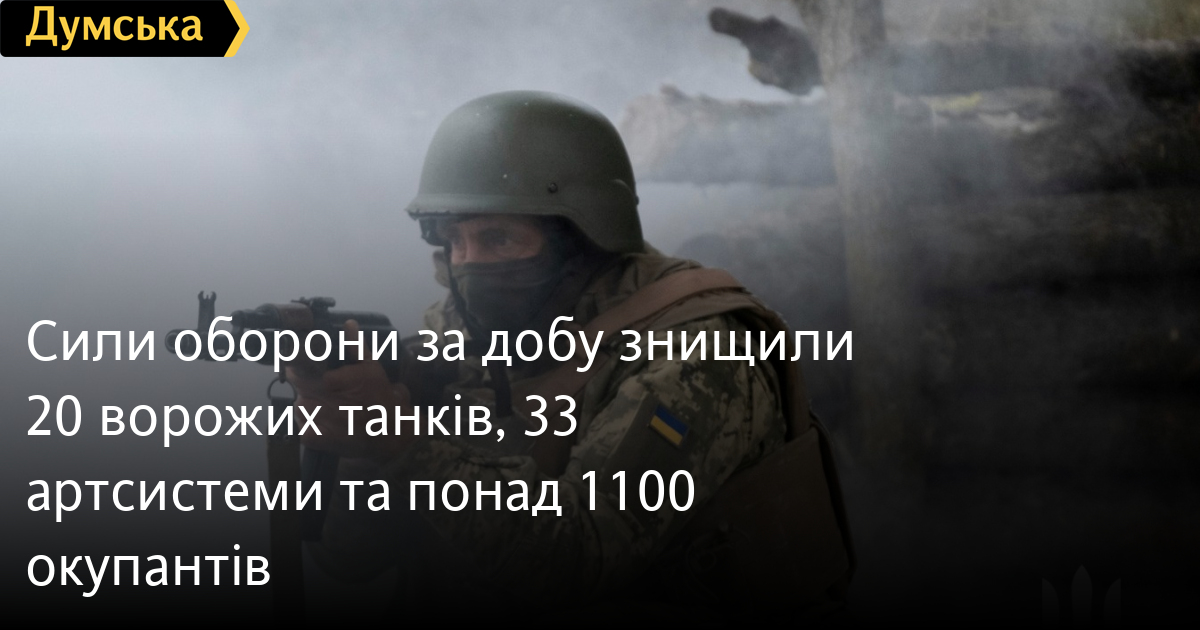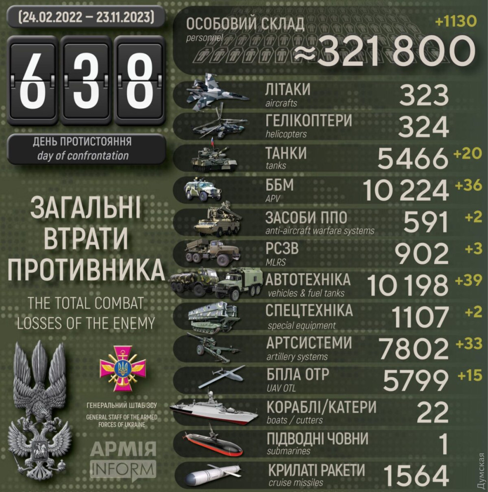 Сили оборони за добу знищили 20 ворожих танків, 33 артсистеми та понад 1100 окупантівПонад 1100 солдатів і офіцерів, 20 танків та 33 артилерійські системи втратили російські загарбники минулої доби. За даними Генерального штабу Збройних сил України, наші захисники також знищили 36 бойових броньованих машин, 3 РСЗВ, 2 засоби ППО, 15 дронів оперативно-тактичного рівня, 39 одиниць автомобільної техніки та 2 - спецтехніки. Загальні бойові втрати противника з 24.02.22 по 23.11.23 орієнтовно становлять: особового складу ‒ 321800 (+1130) осіб ліквідовано танків ‒ 5466 (+20) бойових броньованих машин ‒ 10224 (+36) артилерійських систем ‒ 7802 (+33) РСЗВ ‒ 902 (+3) засоби ППО ‒ 591 (+2) літаків ‒ 323 (0) гелікоптерів ‒ 324 (0) БПЛА оперативно-тактичного рівня ‒ 5799 (+15) крилаті ракети ‒ 1564 (0) кораблі / катери ‒ 22 (0) підводні човни ‒ 1 (0) автомобільної техніки та автоцистерн ‒ 10198 (+39) спеціальна техніка ‒ 1107 (+2) СМЕРТЬ РОСІЙСЬКИМ ОКУПАНТАМ! Помітили помилку? Виділяйте слова з помилкою та натискайте control-enter |