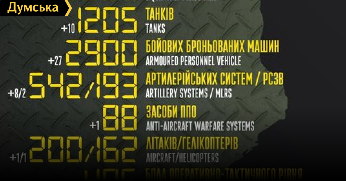 За сутки российские оккупанты потеряли в Украине 250 человек, один самолет и восемь артиллерийских систем250 солдат, десять танков и один самолет потеряли российские нацисты за минувшие сутки в Украине. Кроме того, как сообщает Генштаб Вооруженных сил, украинские защитники уничтожили 27 боевых бронированных машин, восемь артиллерийских систем, две РСЗО, одно средство ПВО, один вертолет, семь БПЛА оперативно-тактического уровня, 23 единицы автомобильной техники и одну крылатую ракету. Всего с начала полномасштабного вторжения потери врага составили: личного состава — 26 900 человек; танков ‒ 1205 единиц; боевых бронированных машин ‒ 2900 единиц; артиллерийских систем – 542 единицы; РСЗО — 193 единицы; средства ПВО - 88 единиц; самолетов – 200 единиц; вертолетов – 162 единицы; БПЛА оперативно-тактического уровня — 405; крылатые ракеты — 95; корабли/катера — 13 единиц; автомобильной техники и автоцистерн — 2042 единицы; специальная техника – 41. СМЕРТЬ РОСІЙСЬКИМ ОКУПАНТАМ! Помітили помилку? Виділяйте слова з помилкою та натискайте control-enter |