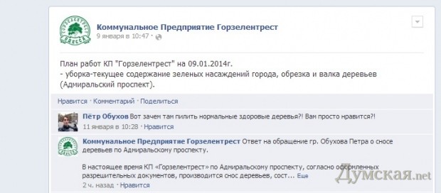 Вскоре после завершения пресс-конференции сотрудники коммунального предприятия все-таки дали о себе знать — на странице коммунального предприятия в социальной сети «Фейсбук» появился комментарий по поводу сноса деревьев на Адмиральском проспекте. Как следует из комментария, спиленные деревья были опасны для людей и соседних деревьев «вследствие возможного заражения различного вида грибковыми заболеваниями».