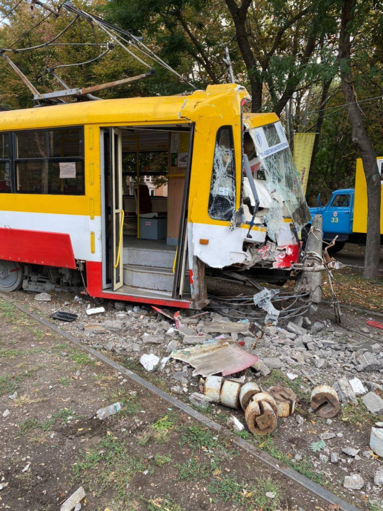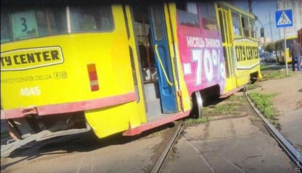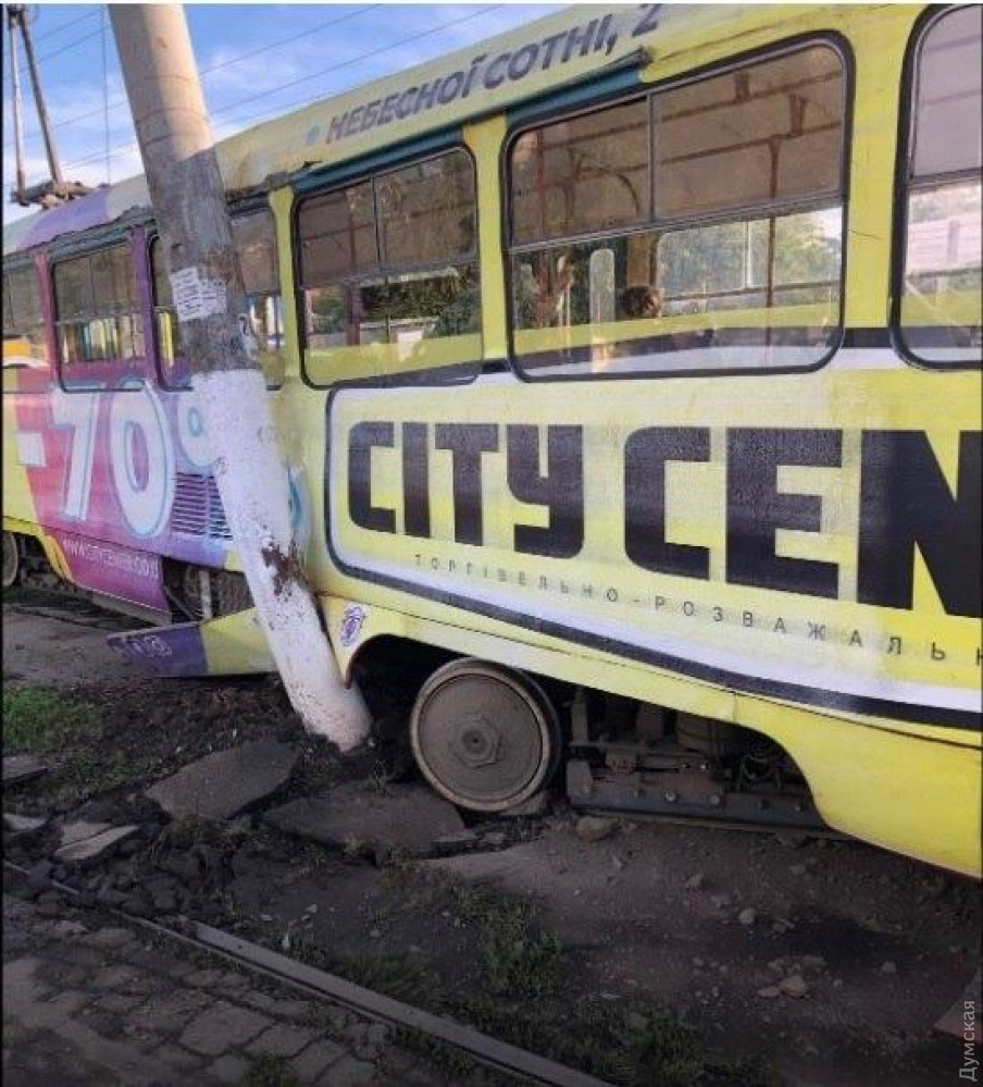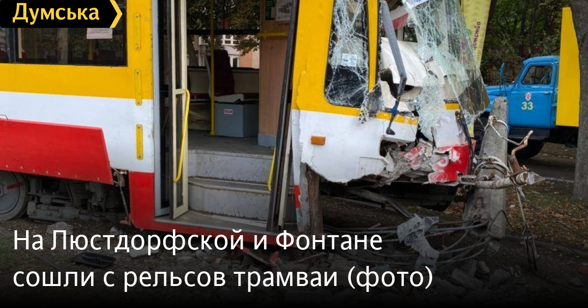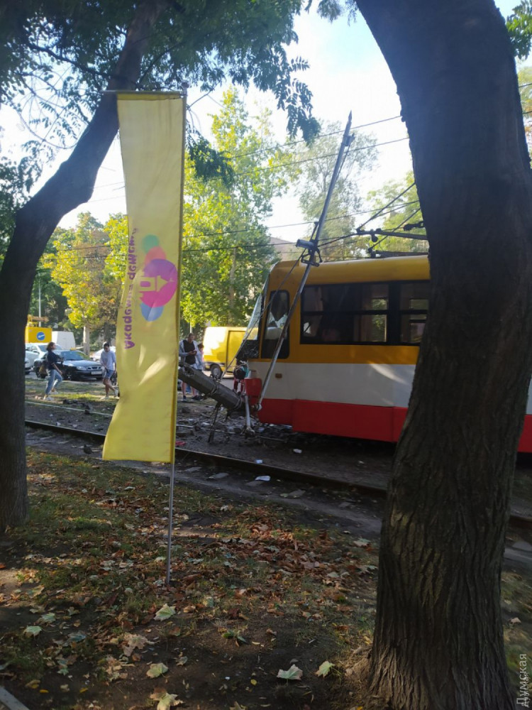 Между 6-й и 7-й станциями Большого Фонтана трамвай маршрута №17 по неизвестным причинам сошел с рельсов, снес железобетонный столб и выехал на встречную линию. К счастью, никто не пострадал, а вот трамваю разворотило кабину.