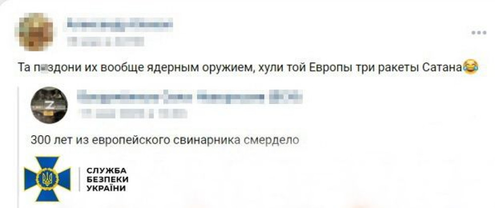 Один з агентів, 37-річний киянин, поширював у російській соцмережі «Вконтакте» заклики до масових убивств українців і використання міжконтинентальних балістичних ракет «Сатана» проти західних країн-партнерів України. Крім того, зловмисник намагався дискредитувати українських військових, зокрема захисників «Азовсталі».