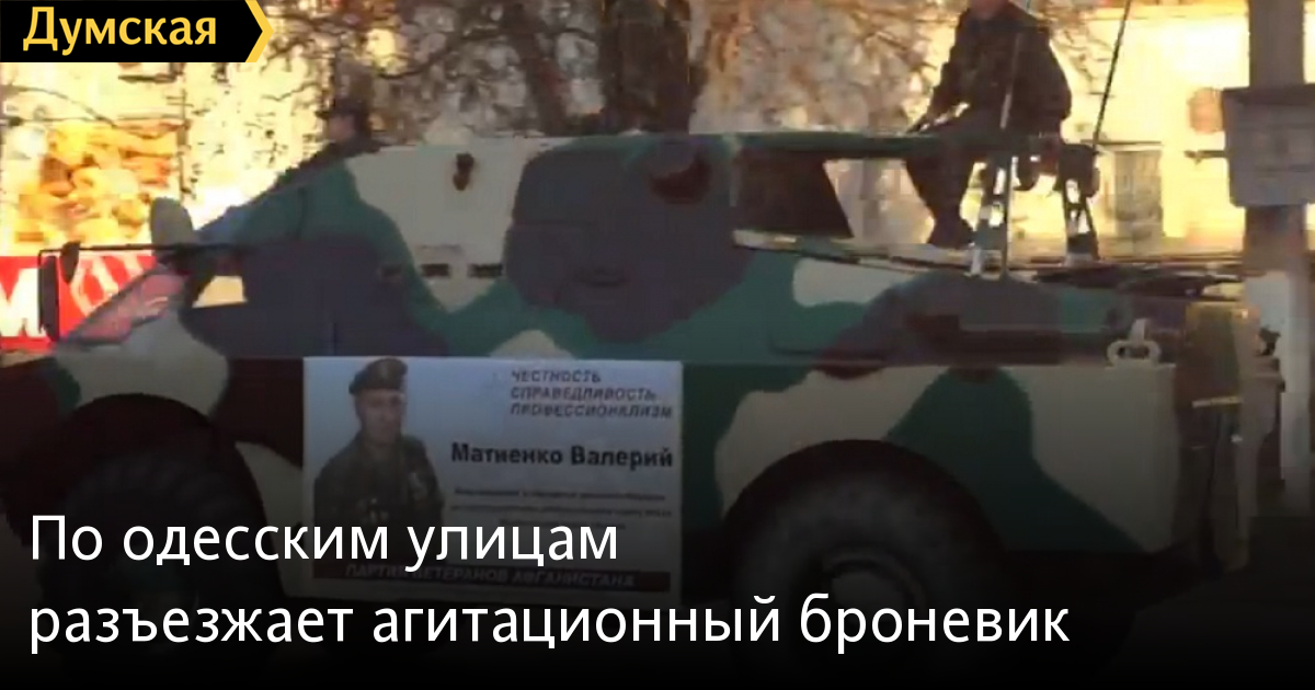 Бронированная дозорно-разведывательная машина (БРДМ-2) была замечена в Малиновском районе Одессы в качестве агитационного автомобиля. Как сообщают очевидцы, на броневике размещена реклама кандидата по 134 округу (Малиновский район) от Партии ветеранов Афганистана Валерия Матвиенко. Как известно, это не первый случай использования бронетехники в предвыборной кампании. Ранее БРДМ разъезжала в Татарбунарах Одесской области, агитируя за местного кандидата от Партии регионов Виталия Барвиненко. СМЕРТЬ РОСІЙСЬКИМ ОКУПАНТАМ! Помітили помилку? Виділяйте слова з помилкою та натискайте control-enter