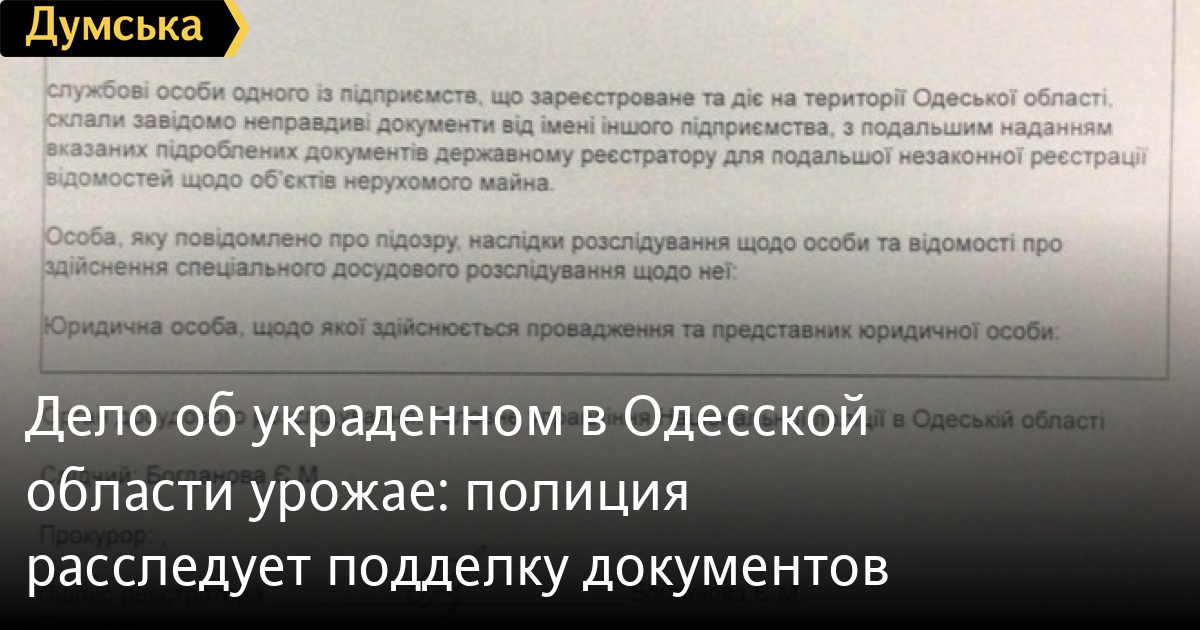 Дело об украденном в Одесской области урожае: полиция расследует подделку документовАграрный скандал, разгоревшийся более года назад в Ширяевском районе Одесской области, где одна из местных компаний якобы собрала чужой урожай, получил неожиданное продолжение. Как стало известно «Думской», в июне этого года в связи с этим конфликтом полиция открыла производство о служебном подлоге. С заявлением в полицию обратилась компания «Антейагро», которую конкуренты обвиняли в незаконном завладении урожаем. Ранее ООО «УкрЗерноТрейд» в СМИ обвинило «Антейагро» в том, что компания уже вторично собирает урожай с земли, арендованной ООО «УкрЗерноТрейд». Однако в «Антейагро» опровергли эту информацию. В компании заявляют, что на самом деле это представители ООО «УкрЗерноТрейд» собирают чужой урожай, используя поддельные документы. По данным «Антейагро», в 2016 году компания заключила договоры об аренде земельных участков с жителями Ширяевского района и засеяла их. Однако когда пришло время собирать урожай, оказалось, что договоры с почти сотней пайщиков расторгнуты — якобы от имени директора самого «Антейагро», и пайщики уже заключили новые договоры с «УкрЗерноТрейдом». Директор «Антейагро» отрицает, что подписывал какие-либо документы о расторжении договоров. Более того, как отмечают в компании, получив из регистрационного дела копии документов, на основании которых проводилась отмена регистрации, руководитель увидел достаточно грубую имитацию своей подписи, заверенную оттиском печати, схожей с настоящей печатью компании. Компания «Антейагро» подала соответствующее заявление в правоохранительные органы, которые уже расследуют подделку документов. По мнению предпринимателей, конкуренты обвинили их в рейдерстве, чтобы отвлечь внимание от собственных правонарушений.