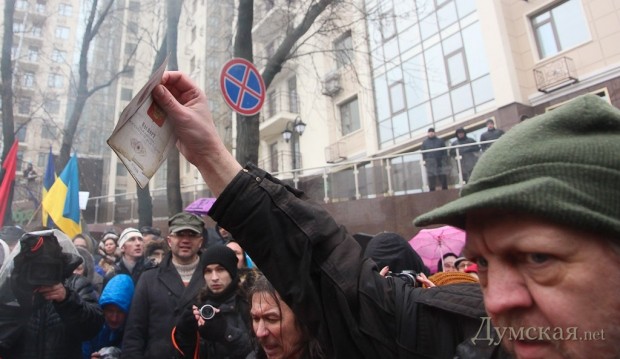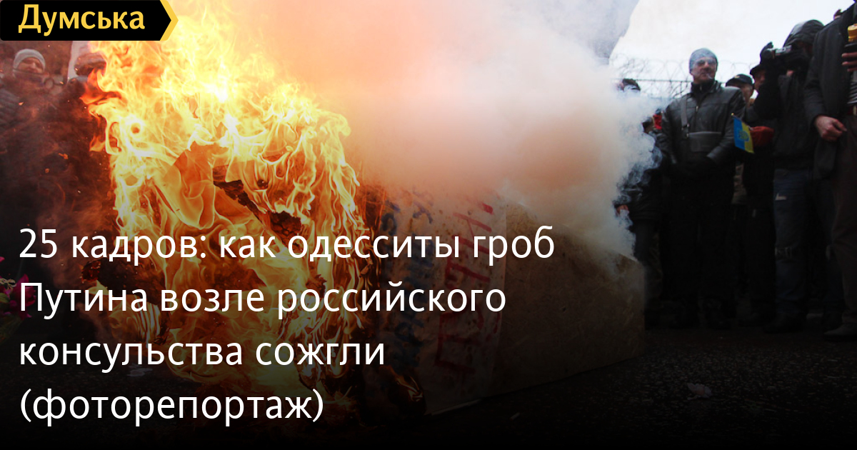 В отличие от ночной акции, сегодня участники проявили большую активность и агрессию — здание консульства закидали гвоздиками и поминальными венками. Пытались даже перекинуть гроб через забор, но этого им сделать так и не удалось — милиция всеми силами пыталась помешать гражданским. В ответ люди кричали «ганьба», а потом под выкрики «Путин, геть из Украины» подожгли гроб. Когда от него остался лишь пепел, объявили минуту молчания, которую назвали минутой радости, потому что «умер Путин». Кроме этого, активисты выдвинули множество требований: называть войну войной, перевести экономику страны на военные рельсы, а также призвать российские войска покинуть территорию Украины. А один из участников — гражданин России — сжег свой паспорт с двуглавым орлом.