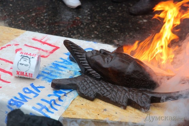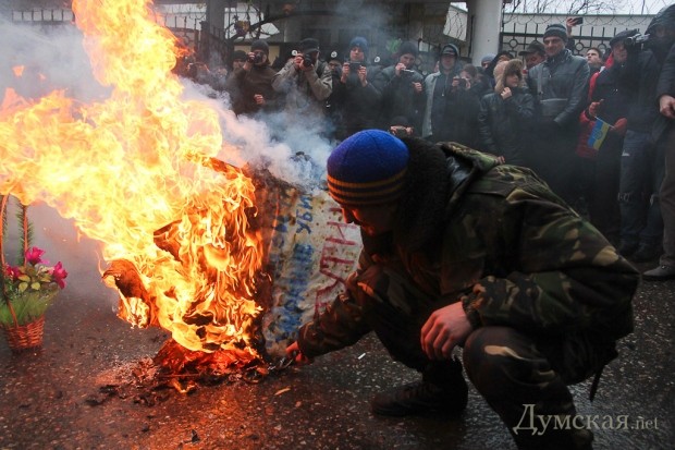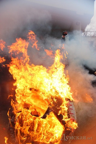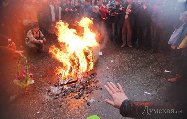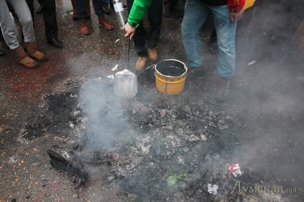 Акция закончилась, как обычно, гимном Украины. Убрав пепел от сгоревшего гроба, активисты поспешили покинуть место действий.