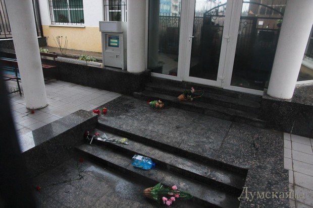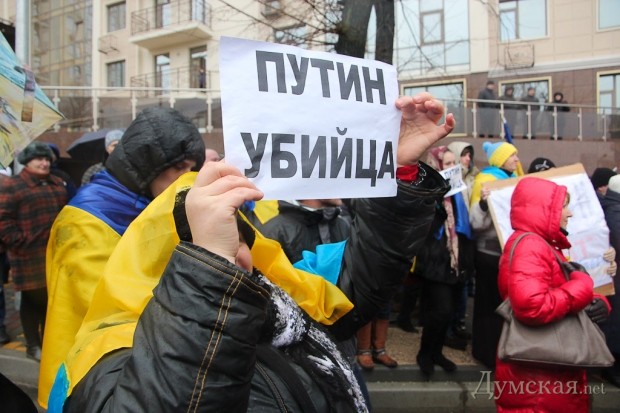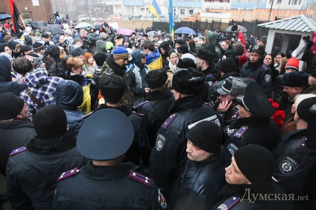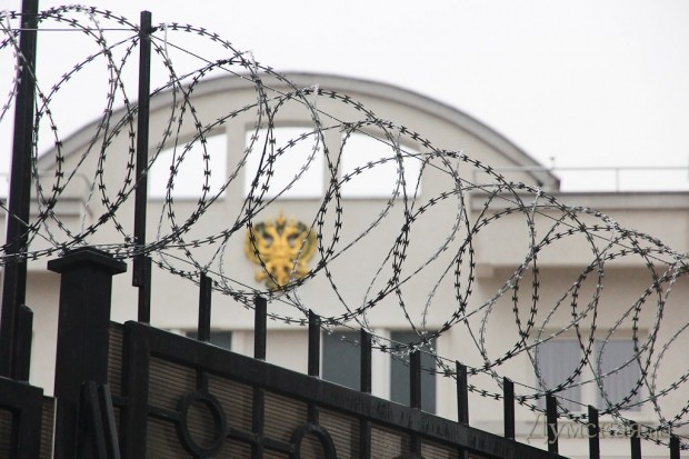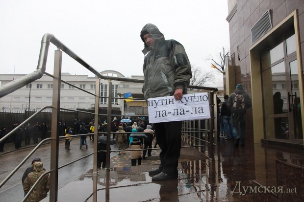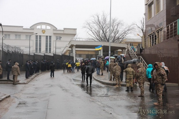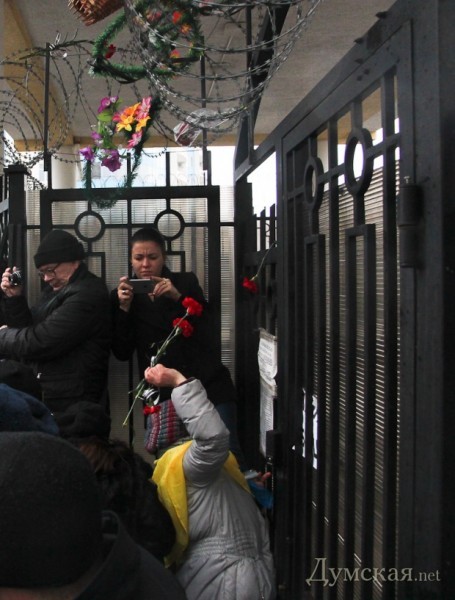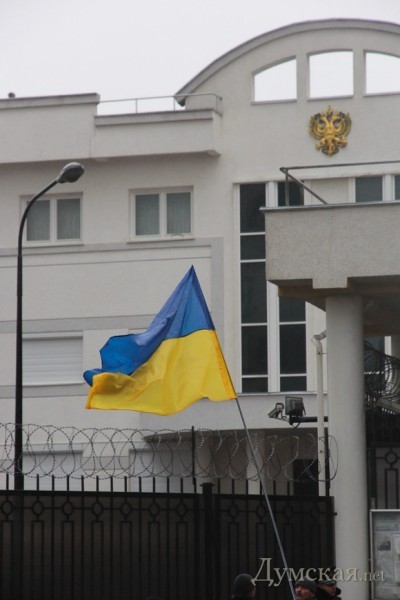 Как и было анонсировано вчера вечером, сегодня под зданием Генерального консульства РФ продолжился митинг в память погибших жителей Мариуполя. После акции, проведенной у аэропорта, на Гагаринском плато собралось около 300 человек, чтобы не только помянуть жертв обстрела, но и добиться закрытия диппредставительства. Люди принесли венки, цветы и гроб с портретом российского президента Путина.
