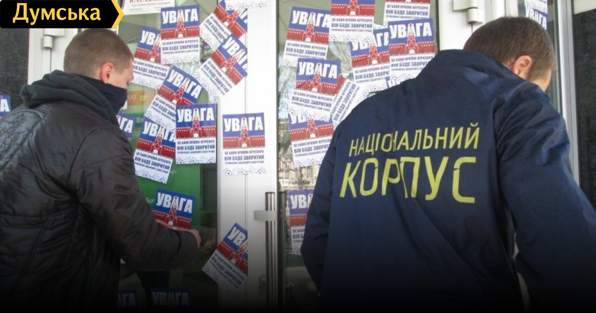 Сегодня днем активисты так называемого «Национального корпуса» устроили акцию возле входа в «Сбербанк», расположенный на углу Ришельевской и Еврейской улиц.