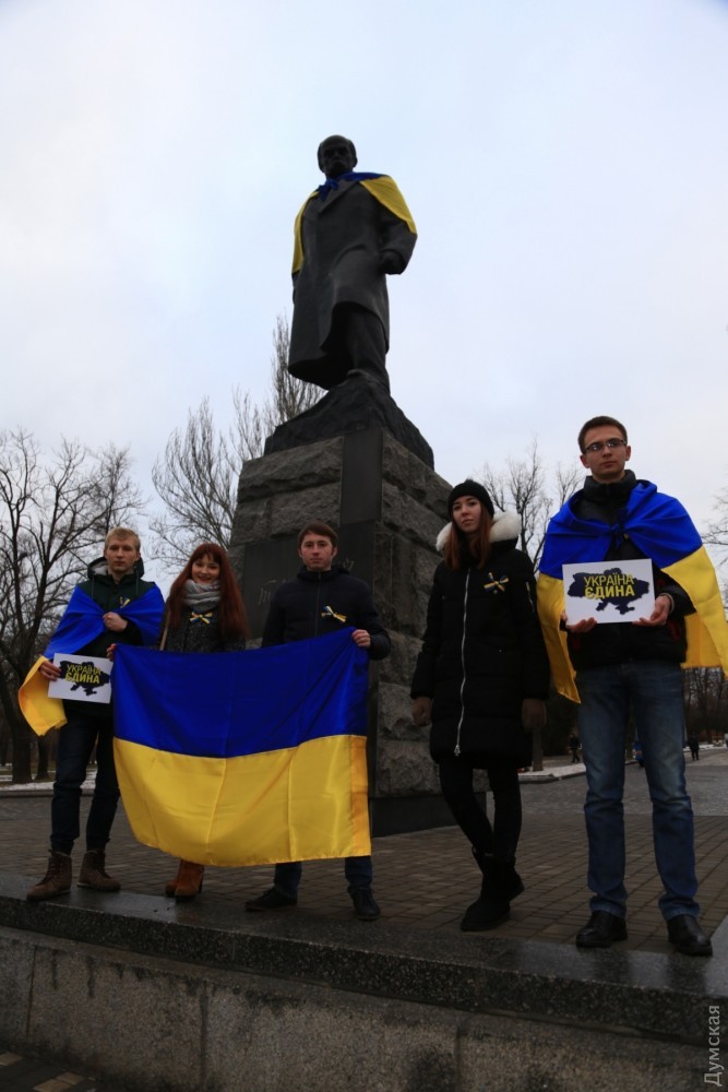 Активисты обернули памятник Тараса Шевченко украинским флагом и раздавали всем прохожим ленты с украинской символикой.