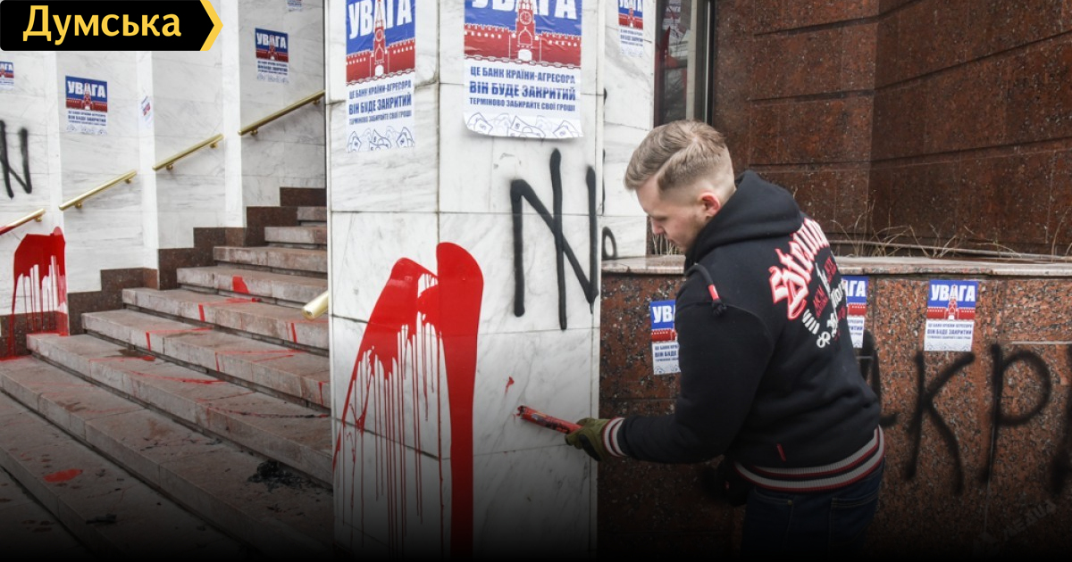 Они облили красной краской входные двери, обклеили листовками и разрисовали стены банка, пишет «Одесса-Медиа».